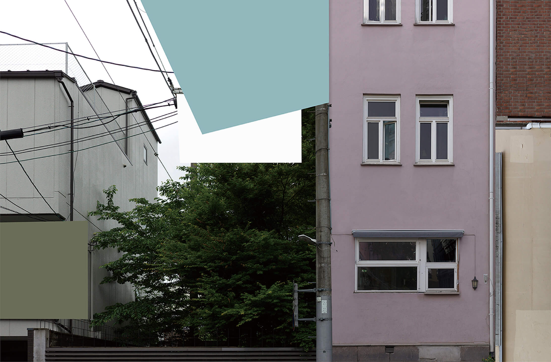 此作品採用拼貼手法,探索東京街頭自然與建築的寧靜平衡。畫面中茂盛的樹矗立在簡潔的