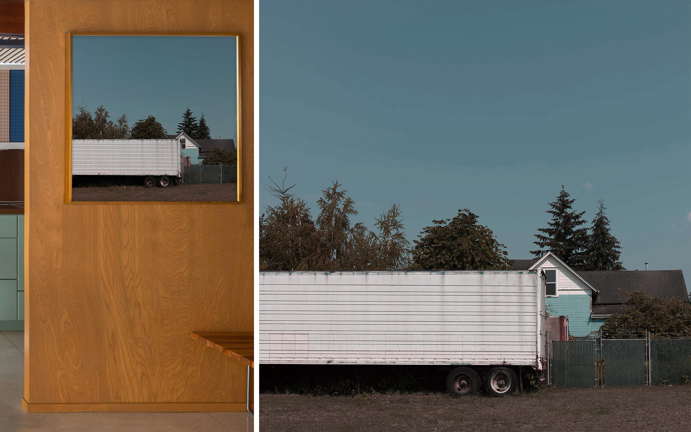 此作品透過廢棄的拖車遮蔽了房屋的一半,創造出獨特的視覺節奏,建築物上的柔和藍色呼應天空