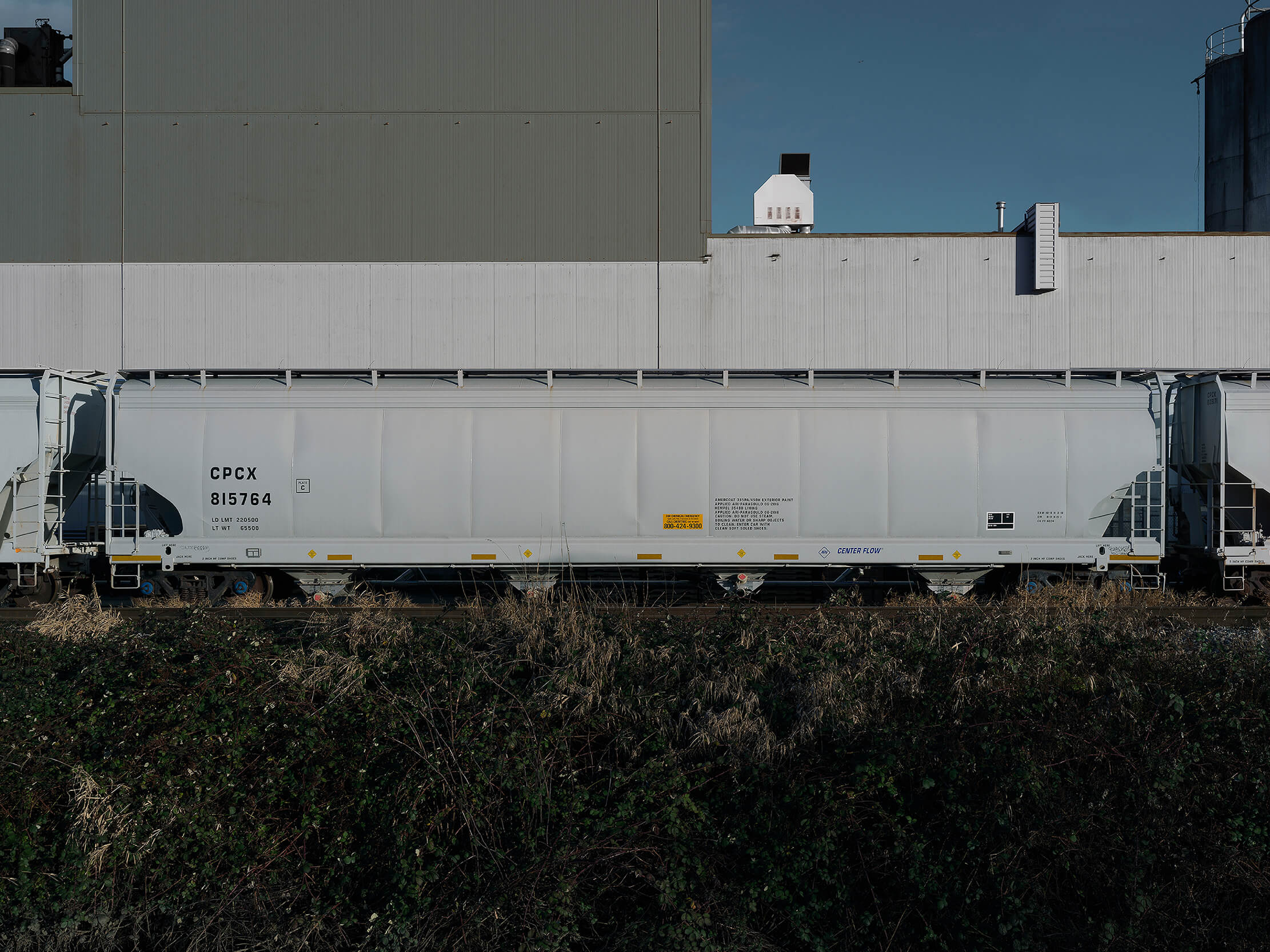 此作品呈現工業環境中的靜止瞬間。原本象徵移動的列車在畫面中轉化為安定的存在,與周遭環境形成清楚的水平
