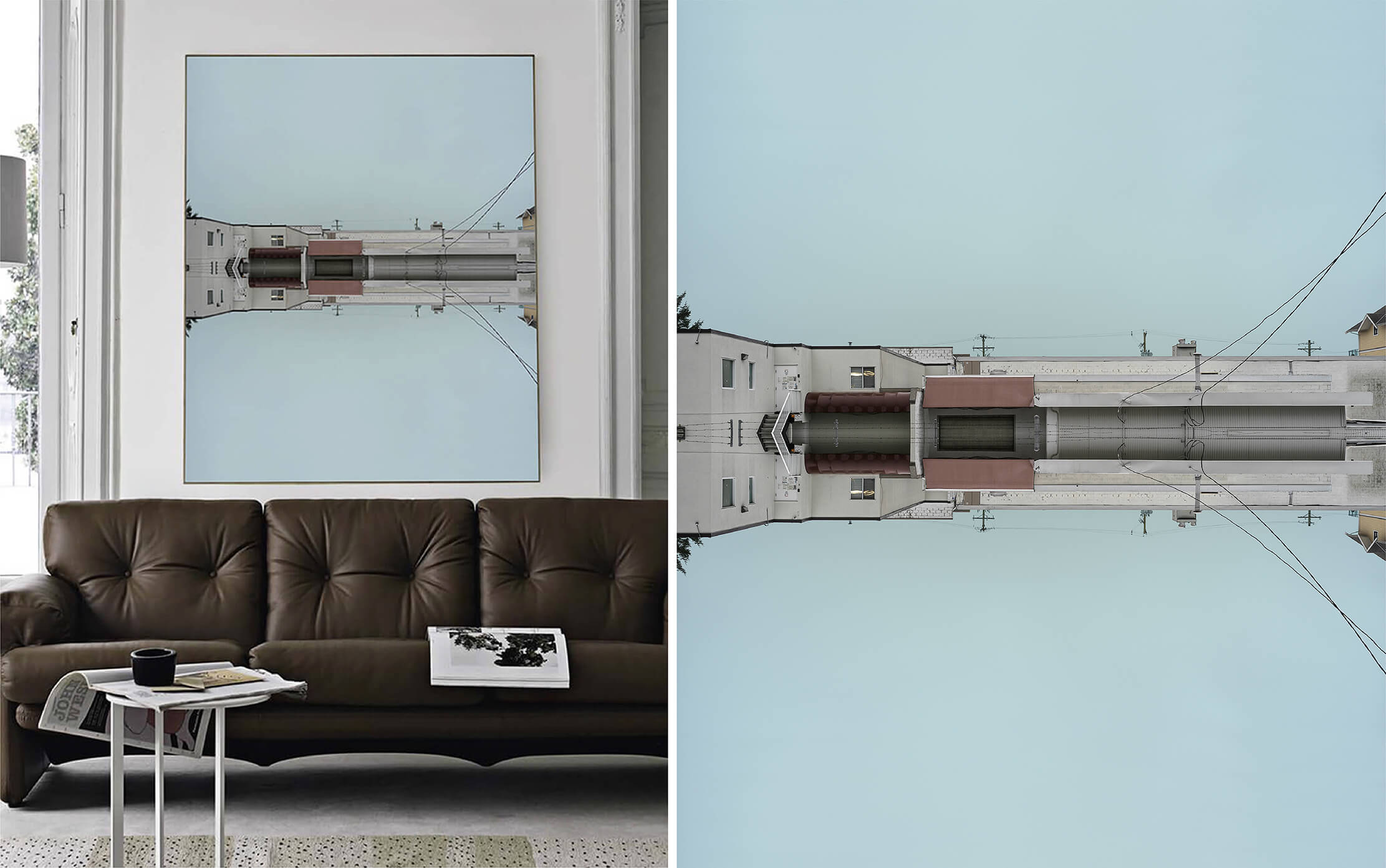 透過垂直鏡像,建築被抽離於重力與現實邏輯之外,成為懸浮於現實與超現實之間的片段。對稱構圖