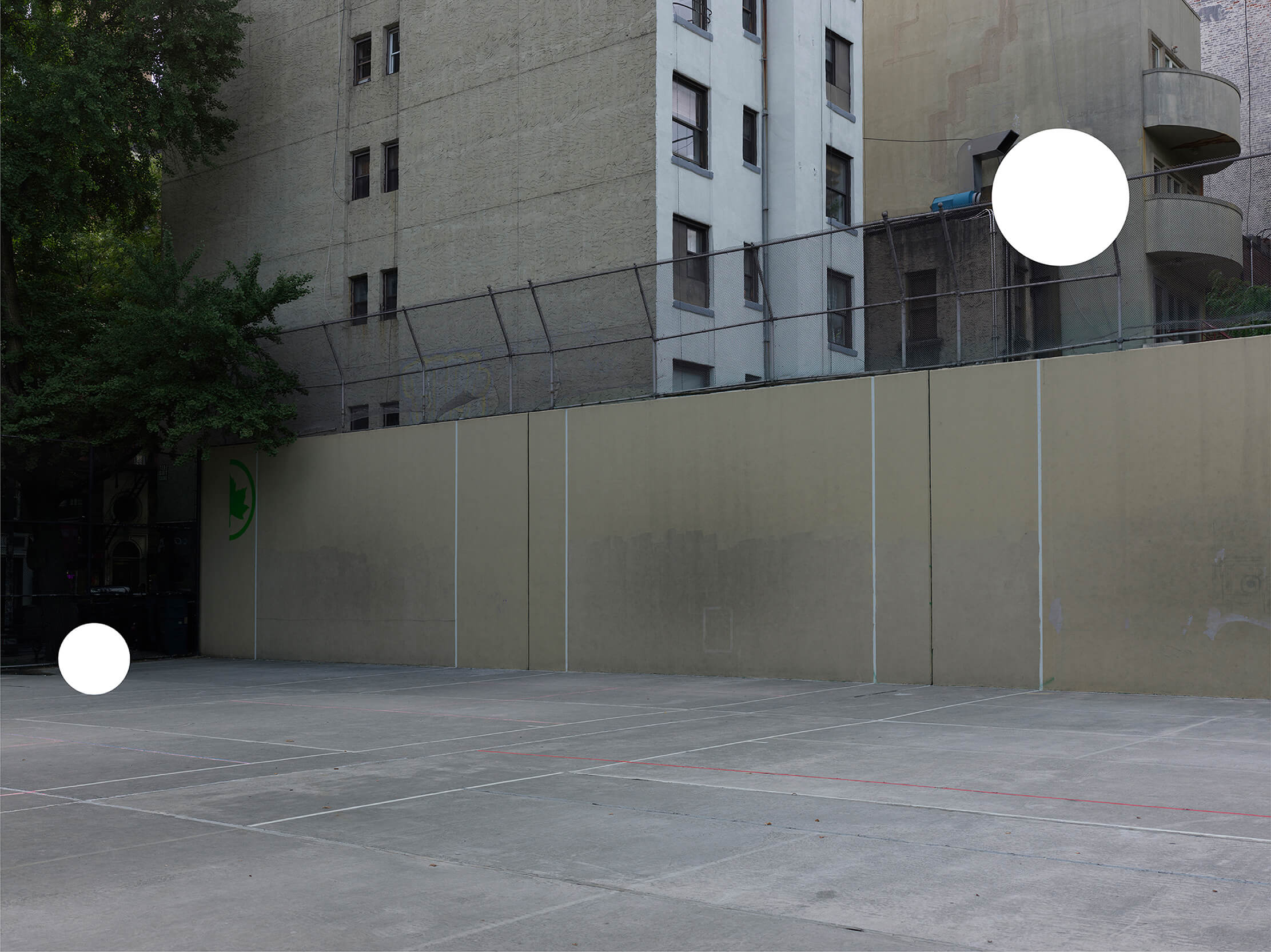 此作品以柔和的平光色調呈現一座位於紐約市的社區運動空間,透過簡潔塊狀的構圖,讓兩個大小