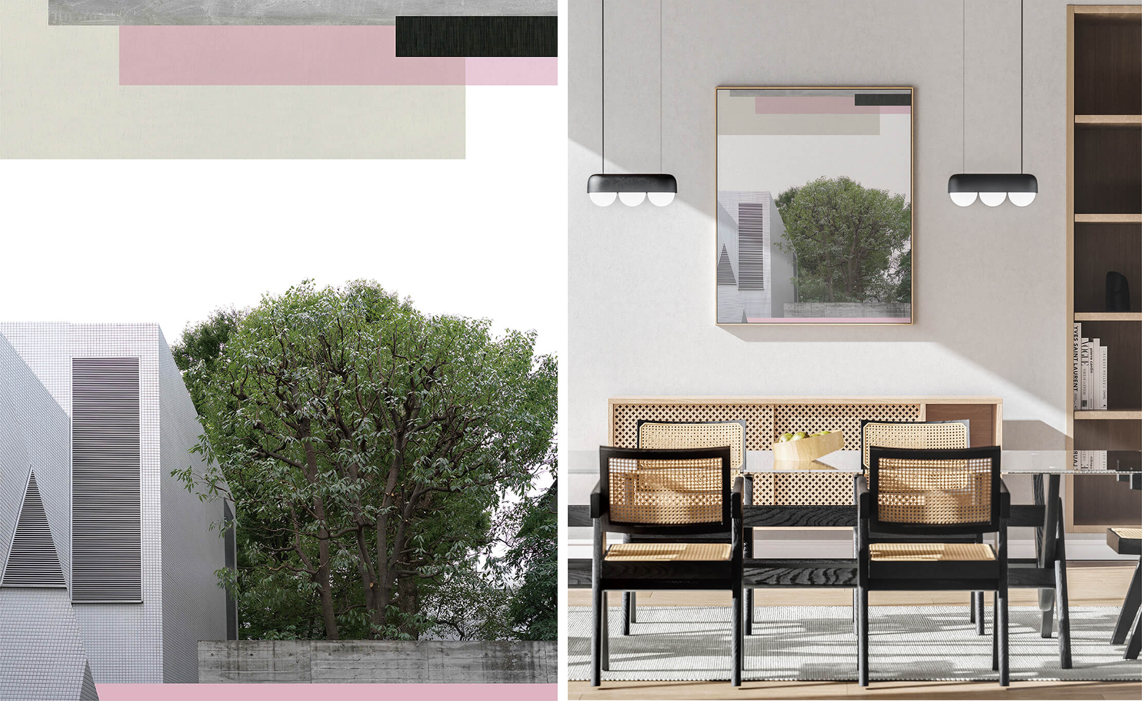 此作品採用拼貼手法,探索東京街頭自然與建築的寧靜平衡。畫面中茂盛的樹矗立在簡潔的