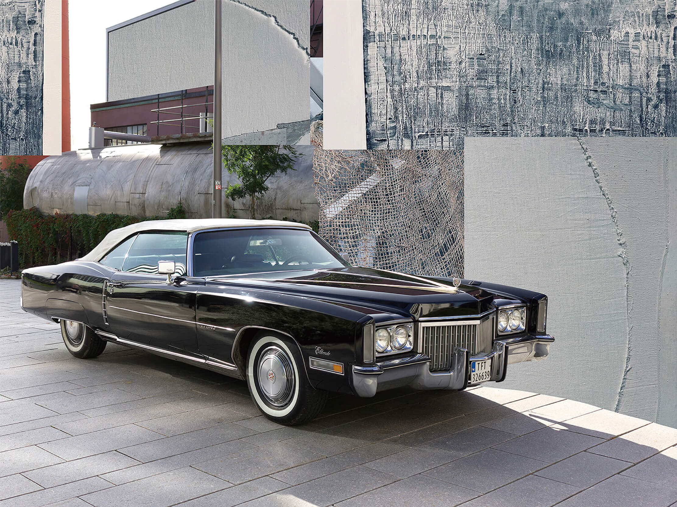 此作品在挪威奧斯陸拍攝,前景是一輛經典凱迪拉克,背景透過不同材質的拼貼手法重塑視覺紋理。