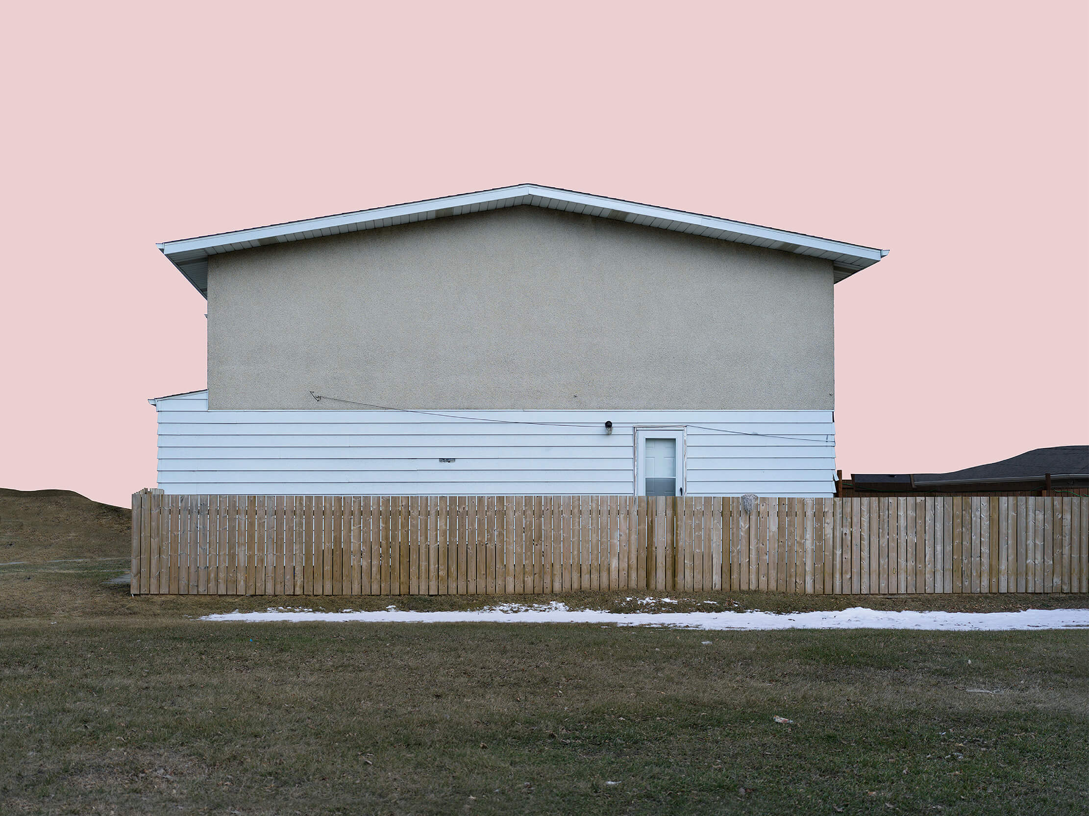 此作品透過廢棄的拖車遮蔽了房屋的一半,創造出獨特的視覺節奏,建築物上的柔和藍色呼應天空